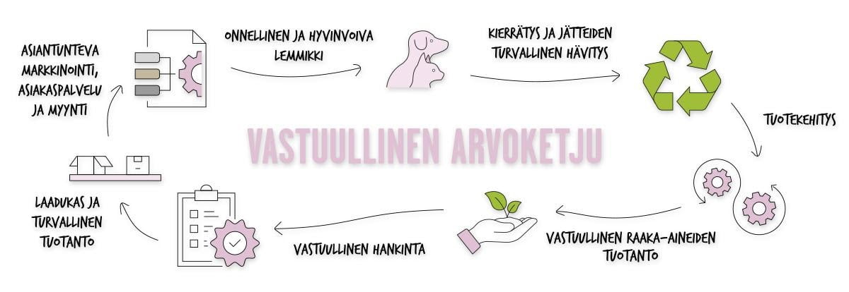 Suomessa ja kotimaisista raaka-aineista valmistettu koiran- ja kissanruoka on turvallista esimerkiksi antibioottien käytön suhteen. Lemmikkienruokaan käytetään meillä ainoastaan elintarvikeraaka-aineita sekä sivuvirtoja, jotka jäävät yli ihmisille tarkoitetusta tuotannosta. Lisäksi tiedämme millaisissa oloissa tuotannon eri vaiheissa ihmiset työskentelevät ja miten eläimiä tulee kohdella kasvatuksen aikana. Vaikka kuljetus on vain pieni osa lopputuotteen hiilijalanjäljestä, on kuitenkin vain järkeenkäypää, että kotimaassa ruokatuotannosta ylijääviä raaka-aineita käytetään lähellä asuvien eläinten ruokintaan.