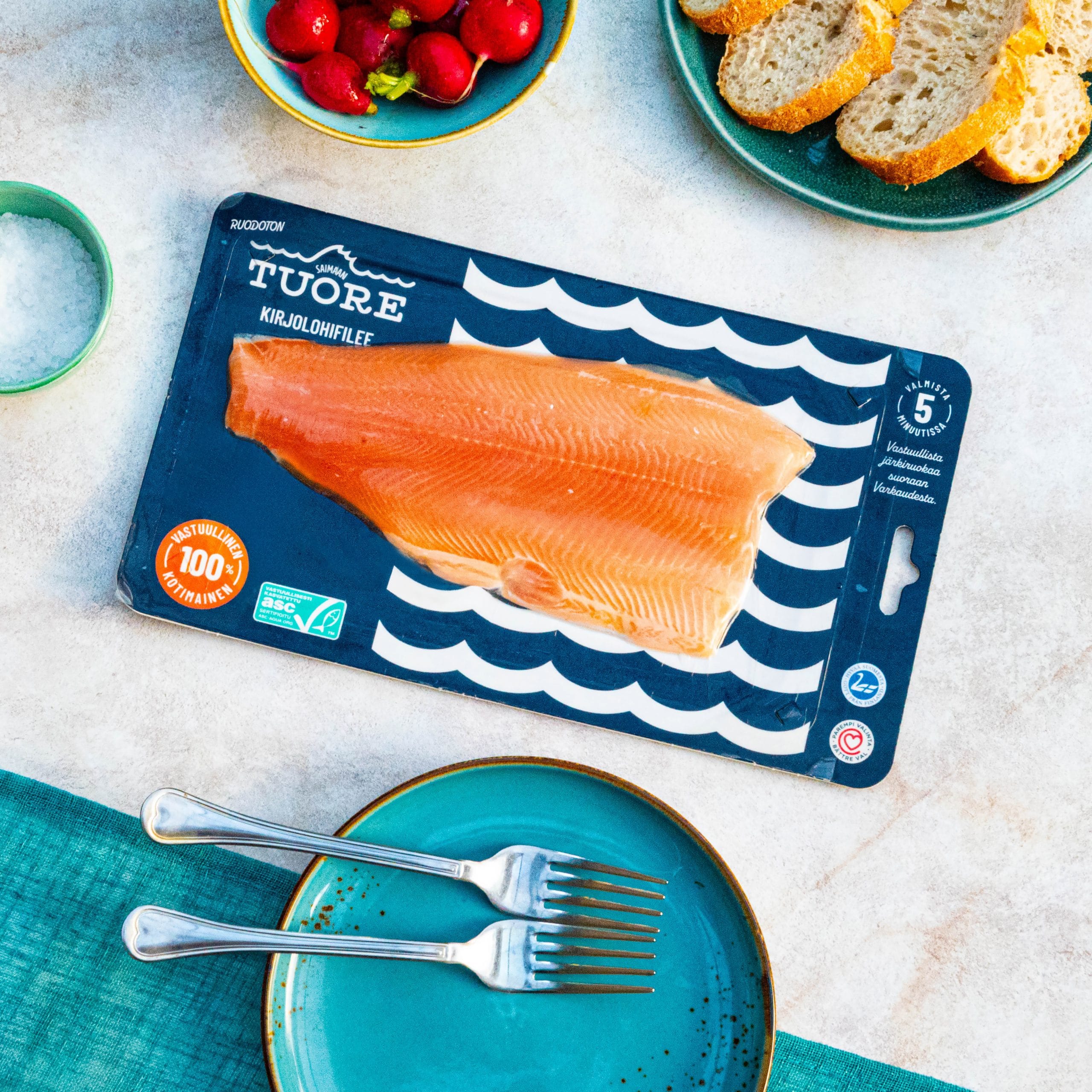 Saimaan Tuoreen annoskokoinen 150 g kirjolohifilee on kotimaista, vastuullisesti kasvatettua kirjolohta Varkaudesta. Yhden annosfileen paketti on juuri sopivan kokoinen yhdelle aikuiselle ja annoskokoisena myytävä kala vähentää ruokahävikkiä. Ei enää kokonaisia kaloja tiskiltä tai kilon pakkauksia pakastimessa, vaan helppo, tuore ja hävikitön ratkaisu arkeen. Mitä tulee ruoan valmistukseen niin Saimaan Tuoreen fileet ovat todellista pikaruokaa. Ne voi lyödä suoraan pannulle tai uuniin ja valmistusaika lasketaan aina minuuteissa. Sekin on tuumattu juttu, että annosfilee on juuri oikean mittainen yleisimmille 26 sentin paistinpannuille.